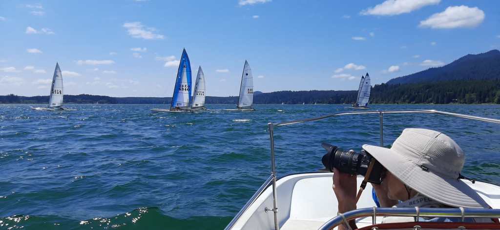Saturday, the weekend’s first day of racing, dawned a bit cloudy as Canada Geese honked overhead, summoning the racers to get a move on. Sailors from Washington, Oregon, Colorado, Oklahoma, Wyoming, Oregon, British Columbia Canada and beyond gathered under the campground’s log cabana for the skipper’s meeting. Informed that the wind had yet to fill in, they milled around and futzed with their boats until race PRO Charley Rathkopf finally sounded the horn for a 1:30 start.